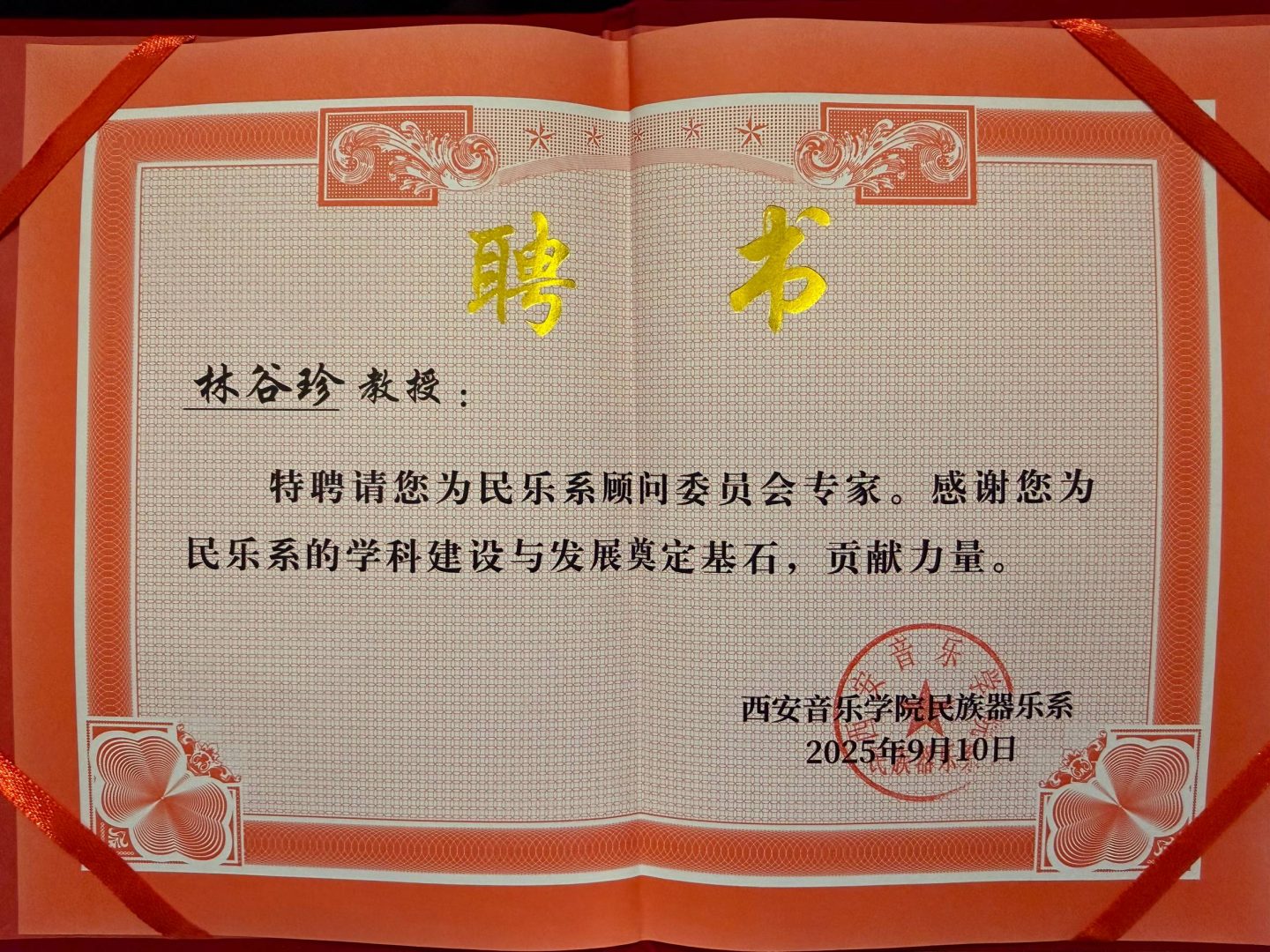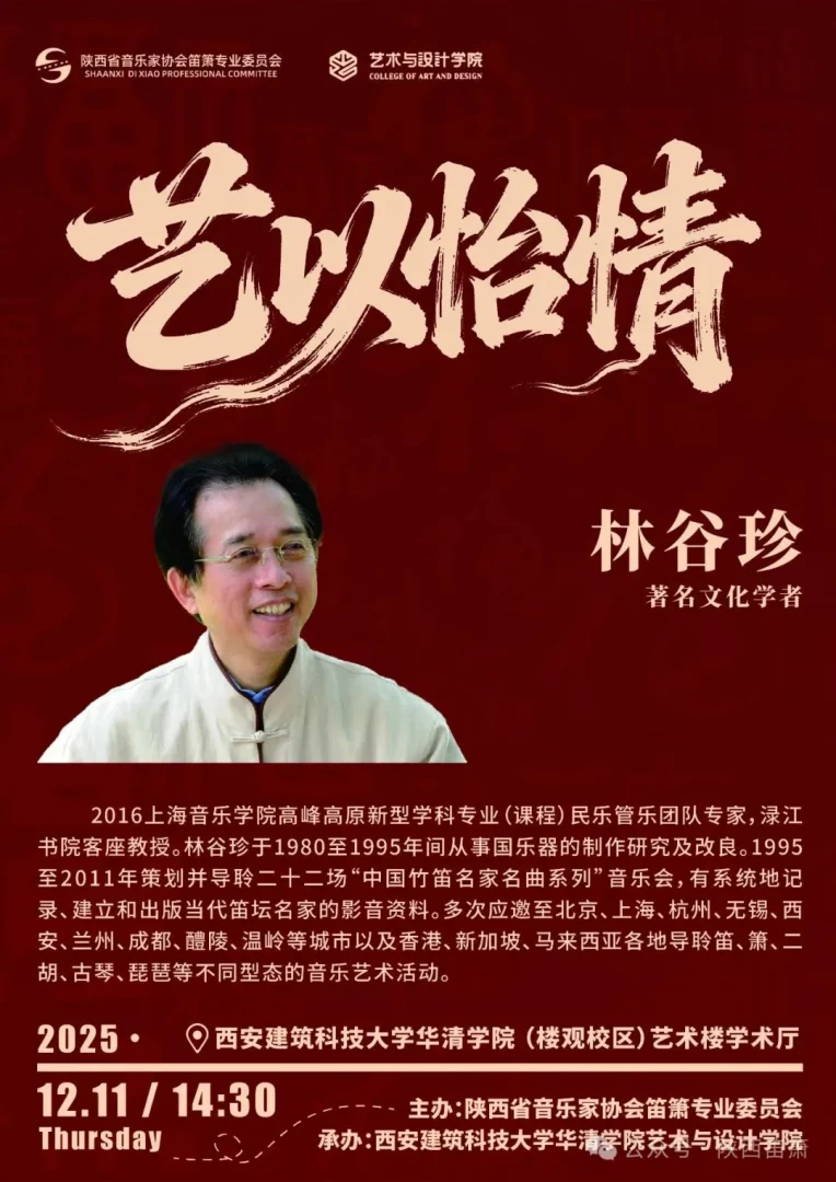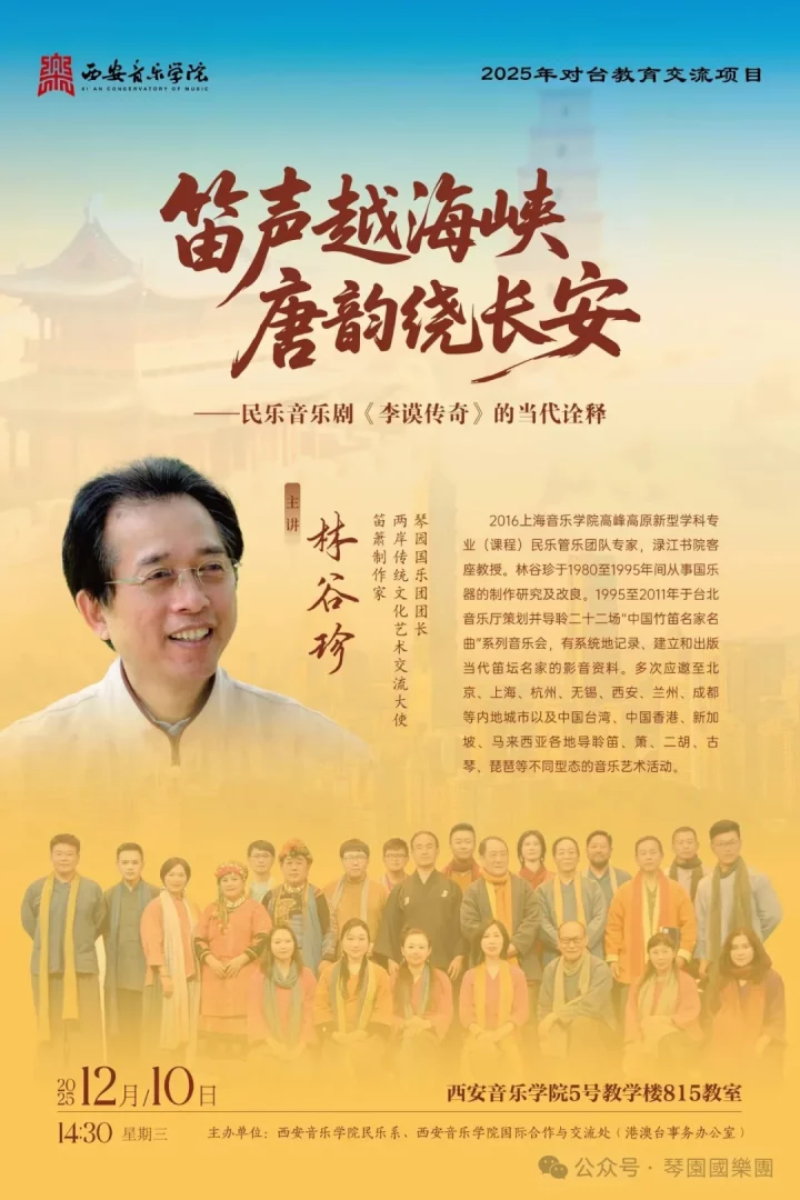 琴園國樂團團長、兩岸傳統文化藝術交流大使、笛簫製作家 林谷珍 老師,於 2025 年 12 月 應邀赴西安舉辦兩場專題講座,分別於 西安音樂學院 與 西安建築科技大學華清學院 登場,從音樂創作、文化詮釋與藝術精神等層面,分享其多年深耕民族音樂與文化交流的實踐與思考。